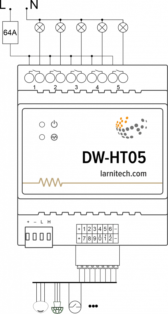 In order to protect the actuator and loads connected to it, installing a circuit breaker is recommended. The nominal value of the circuit breaker should be calculated based on the maximum total load of connected devices and at the same time should not significantly exceed the maximum permissible characteristics of the actuator. Depending on the requirements, you can use one circuit breaker for one actuator (it is recommended) or one circuit breaker per each group of connected loads, or, if necessary, a separate circuit breaker can be installed for each load.