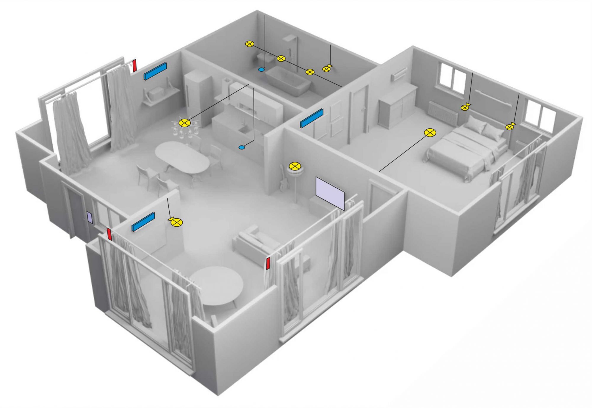 - частные квартиры, в проекте умного дома могут быть следующие разделы: управление отоплением, управление кондиционированием, вентиляцией, управление освещением, различными приводами штор, жалюзи, контроль утечки воды, видеодомофон, система мультирум